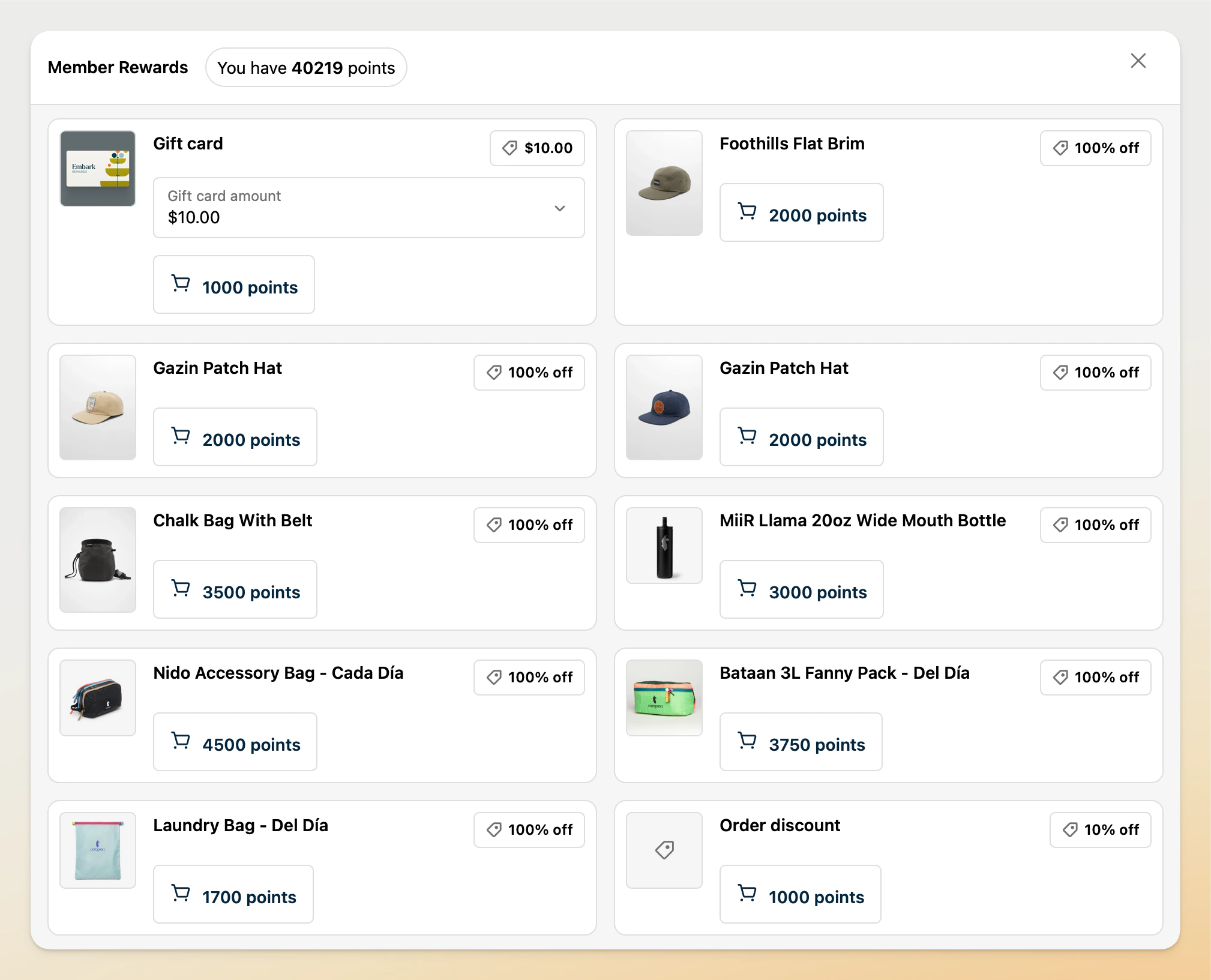 Gives logged in members options to redeem points for new rewards or apply existing rewards to checkout.